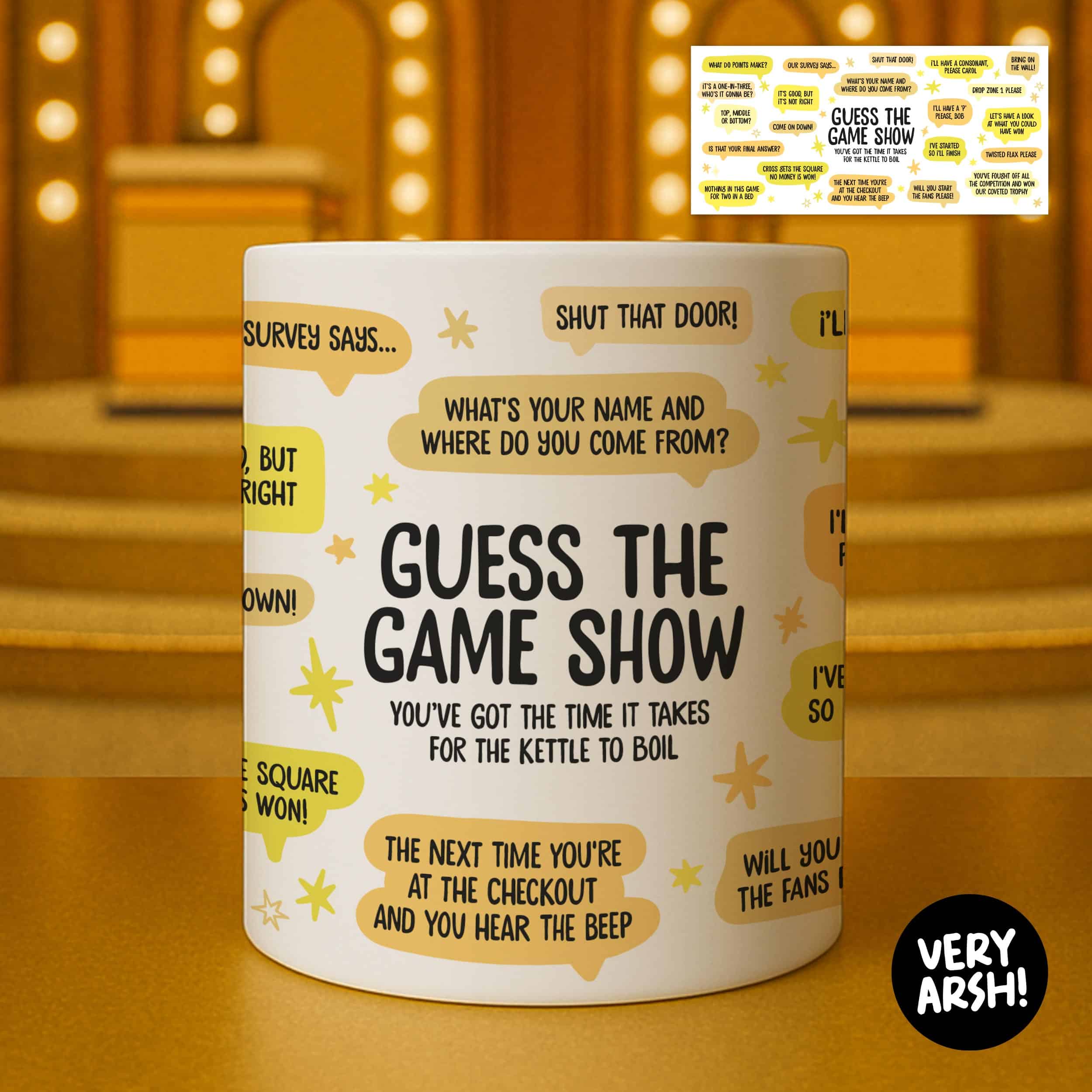 Test your knowledge with this Guess The Game Show – Quiz Quote Mug – perfect for any fan of TV quiz shows.